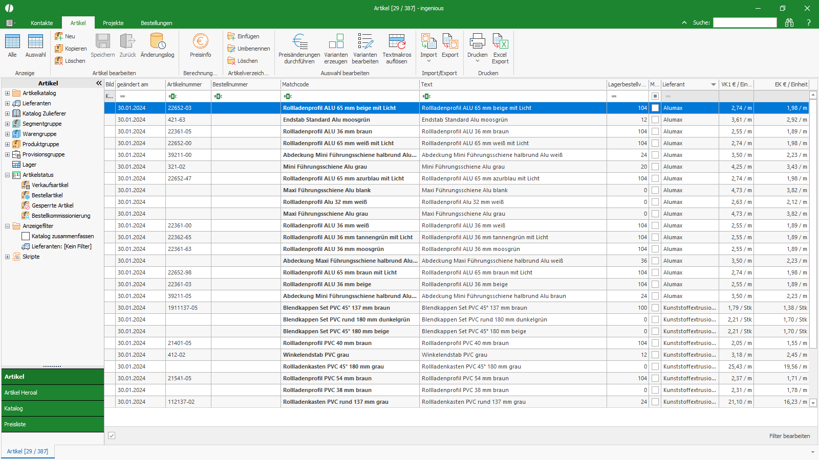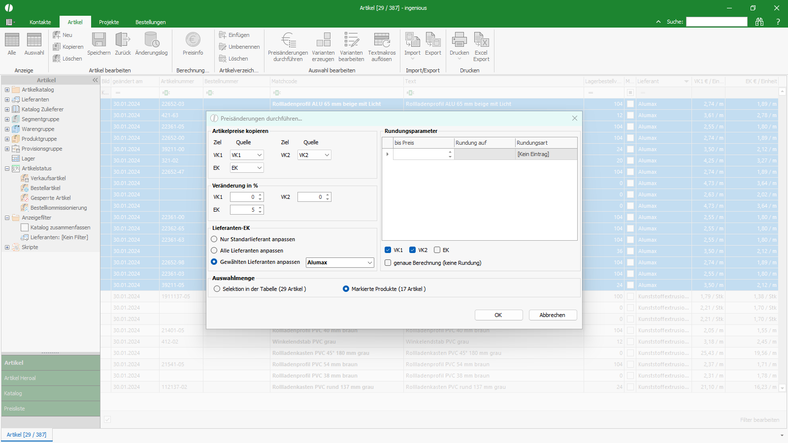 - Preisänderung für alle in der Tabelle angezeigten (Selektion) oder markierten Artikel